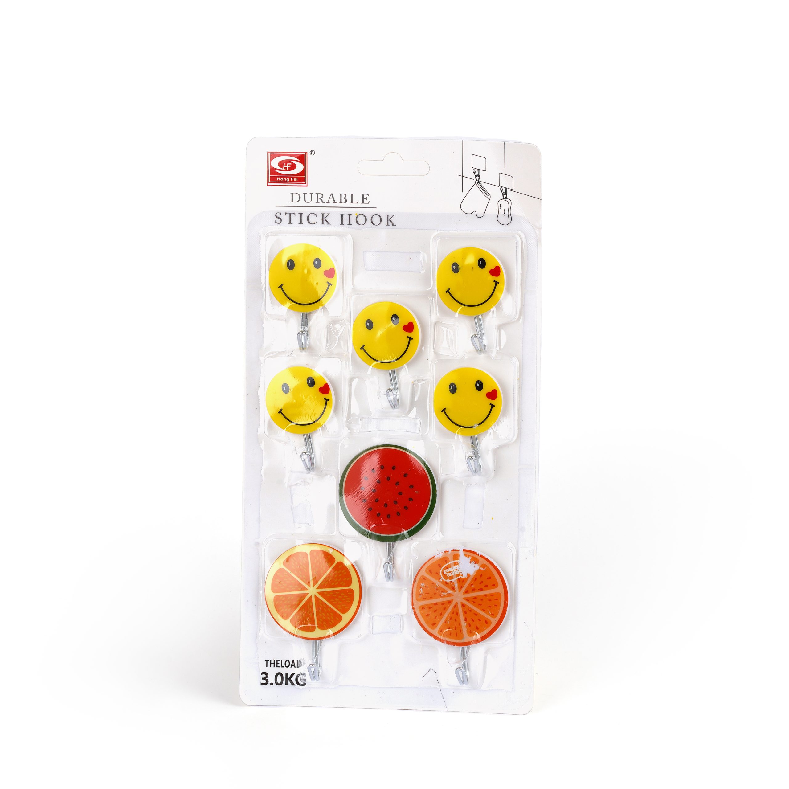 Fun set of 9 stick-on hooks featuring smiley faces and fruit prints (orange, grapefruit, watermelon). Each holds 3KG.