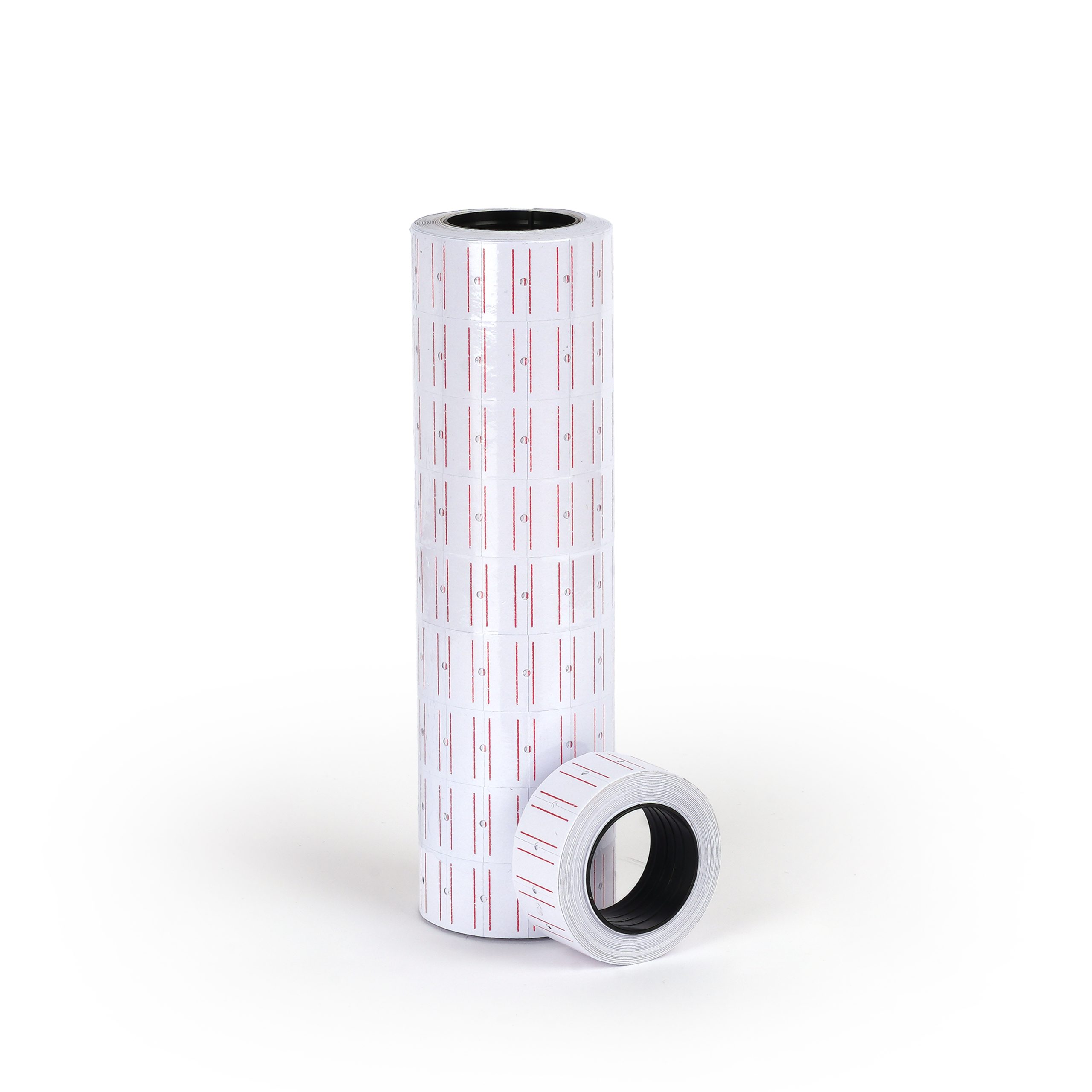 Self-adhesive price label roll, white with red borders, 22x12mm size, perfect for pricing guns and labeling tasks.