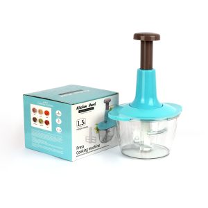 Manual food processor with a press-down mechanism and 1.5L capacity. Features a turquoise body and brown handle. Great for chopping vegetables, nuts, and herbs quickly and safely.